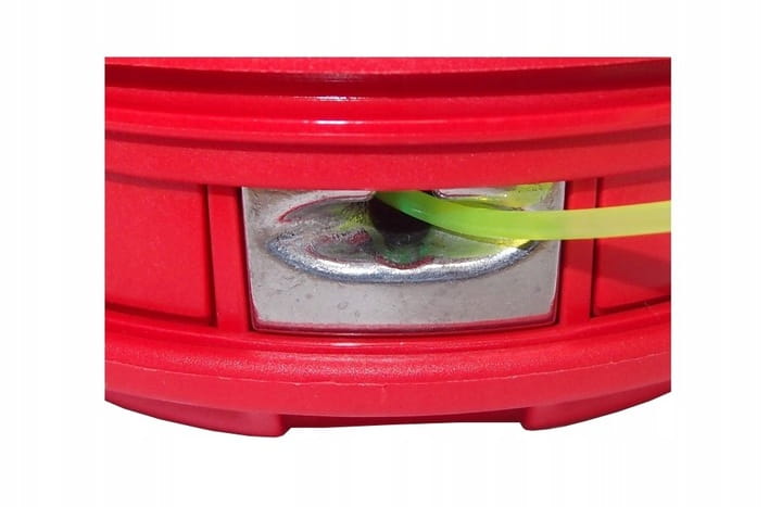 Zastosowanie sztywnej sprężyny ze stalowego drutu o grubości 2,5 mm zapobiega niekontrolowanemu wysuwaniu się żyłki tnącej, co zwiększa bezpieczeństwo i płynność pracy. Aluminiowe przelotki o specyficznym profilu ułatwiają wysuwanie żyłki, minimalizując tarcie i poprawiając jej reakcję podczas pracy. Szpulka głowicy posiada 3 wycięcia nawinięcia żyłki, które pozwalają na szybkie i bezproblemowe złożenie głowicy po nawinięciu żyłki, bez konieczności skomplikowanego montażu.